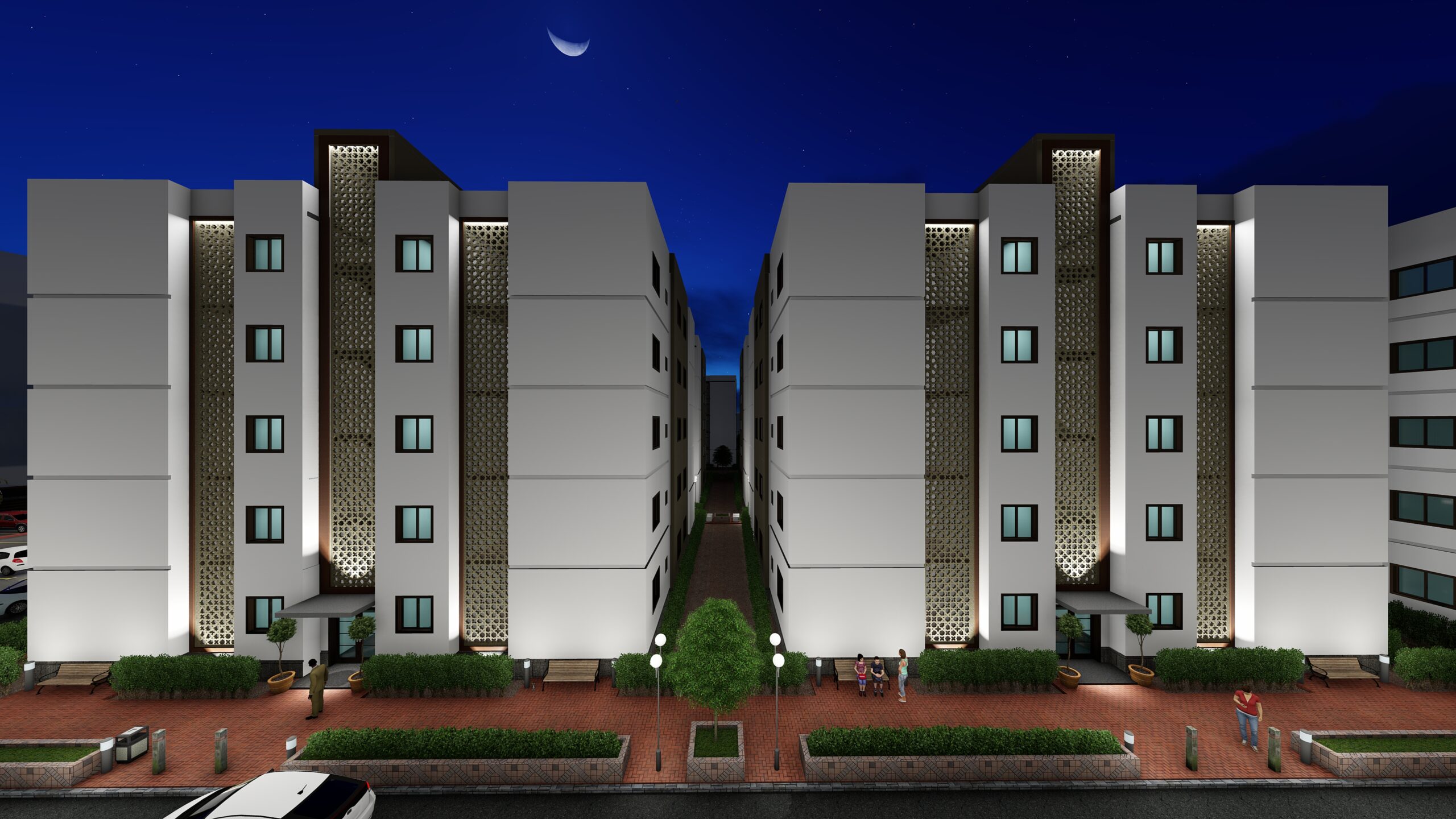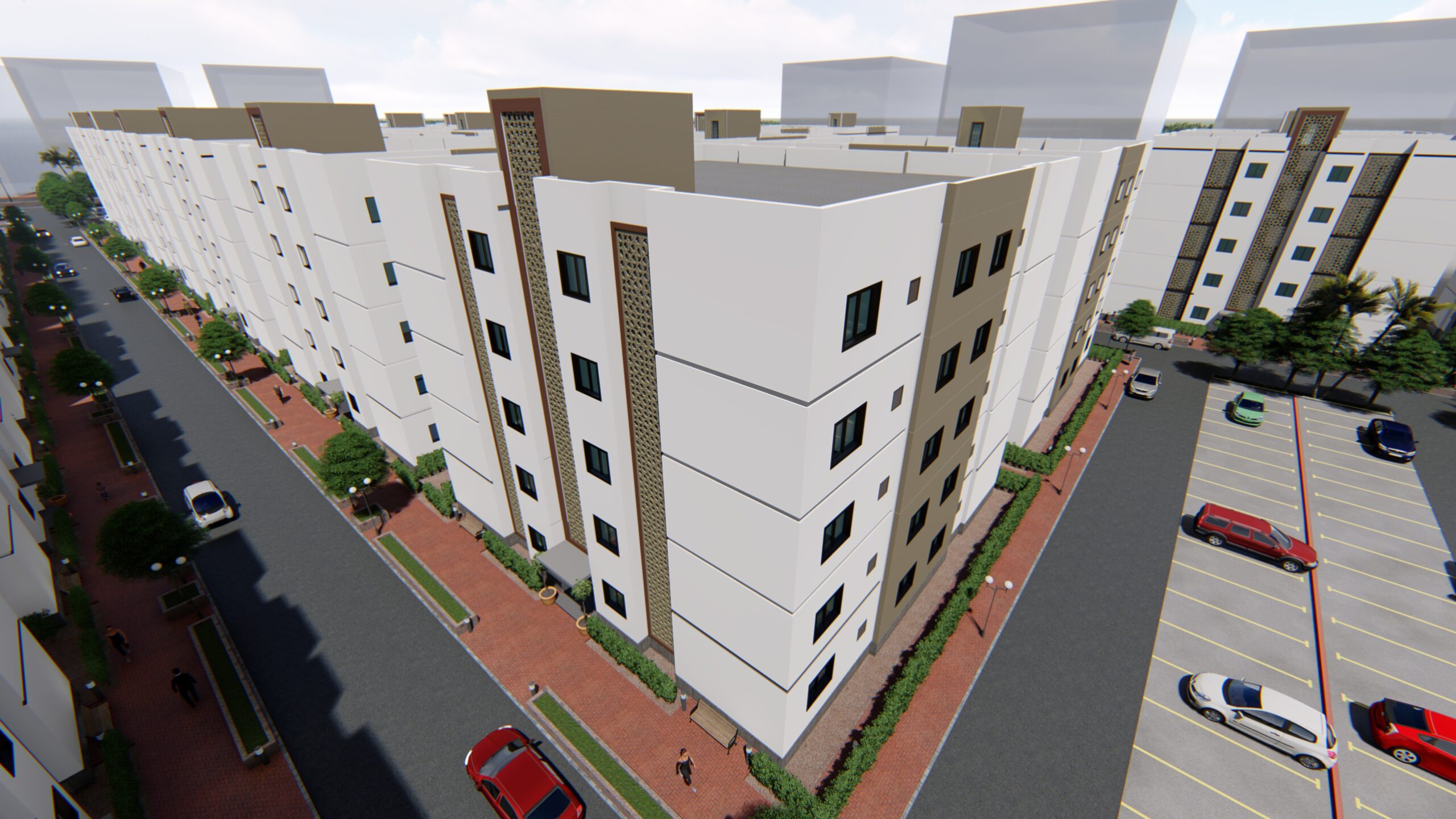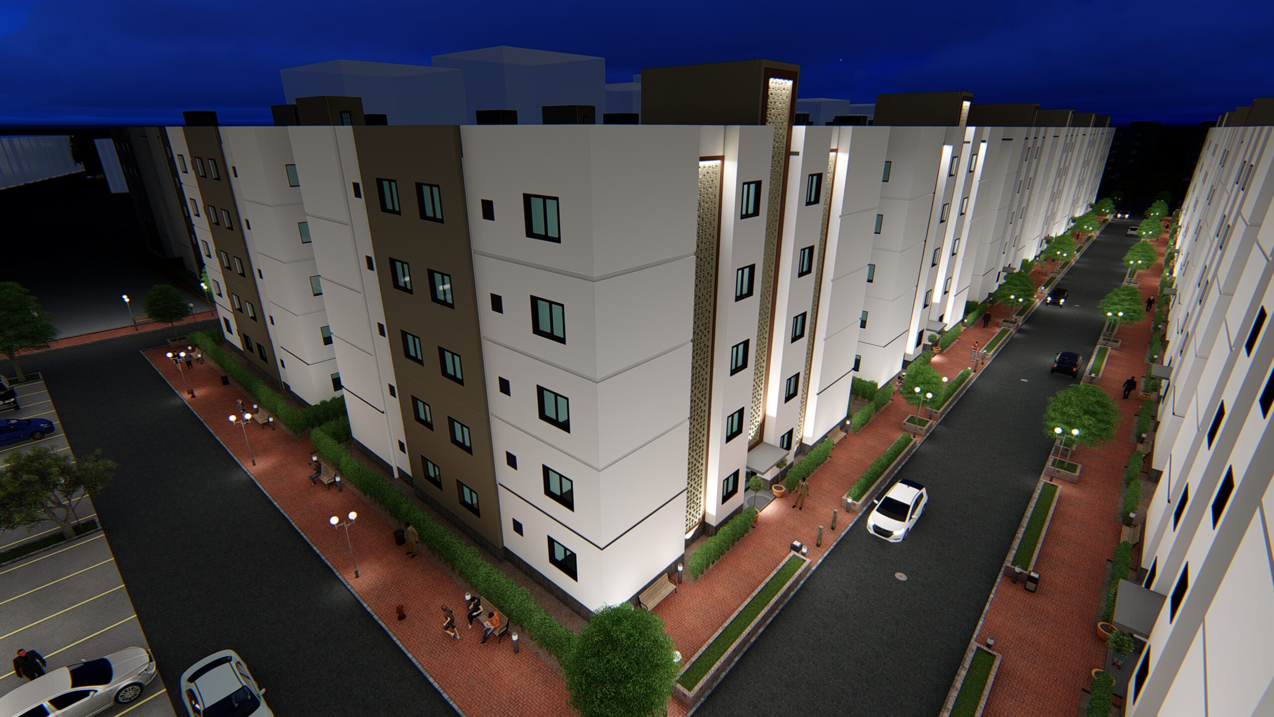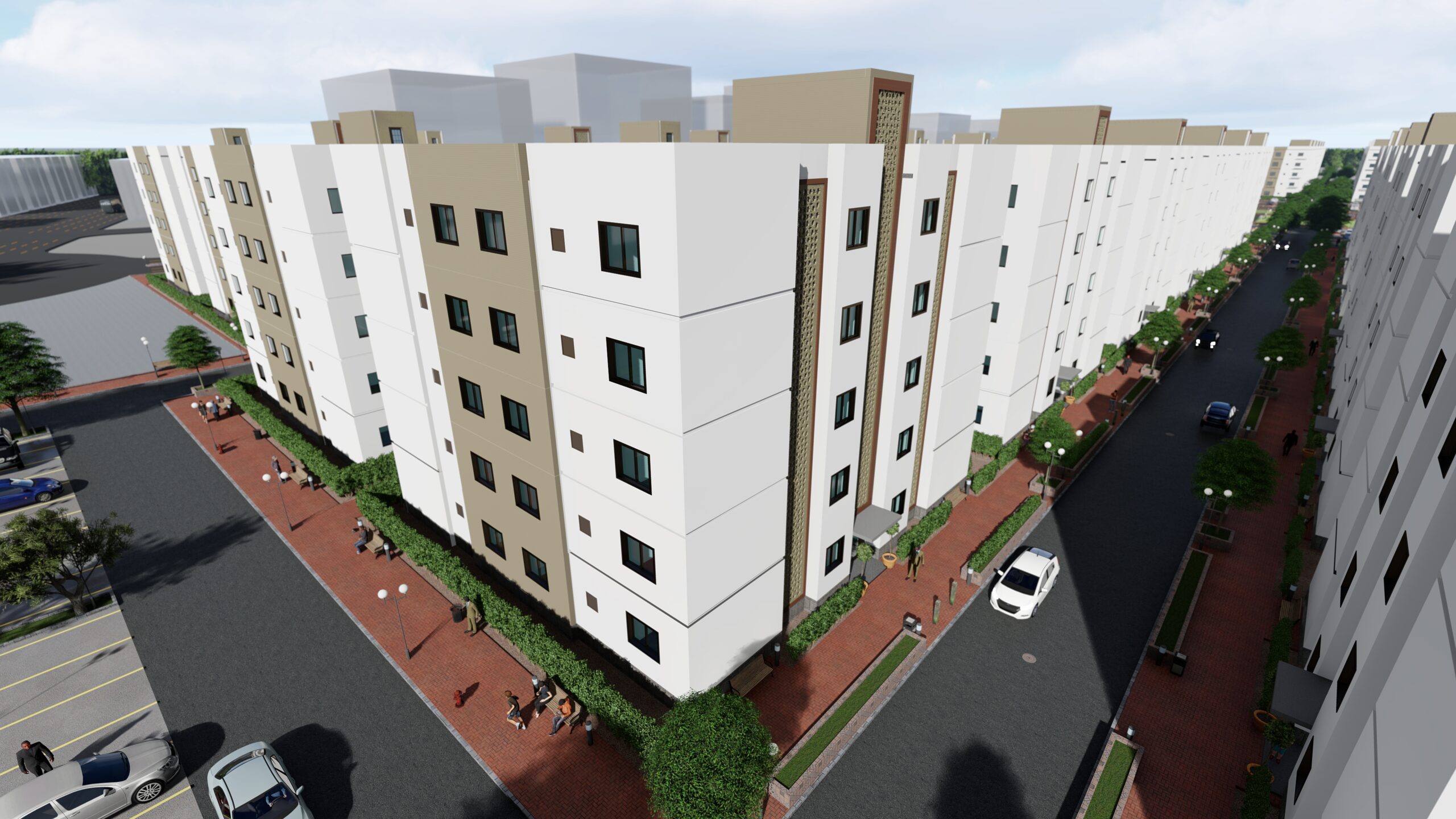 La cité « Les Résidences Etoile » possède son propre écosystème d’espaces communs, tels que le club house pour les loisirs, des aires de jeux, des zones commerciales et de vastes espaces de stationnement. 65% du terrain a été consacré aux espaces communs, ce qui montre la grandeur du projet. Chaque bâtiment dispose de quatre espaces ouverts pour accueillir la lumière du soleil et l’air frais dans chaque appartement. Les appartements sont conçus pour accueillir du mobilier de standing.