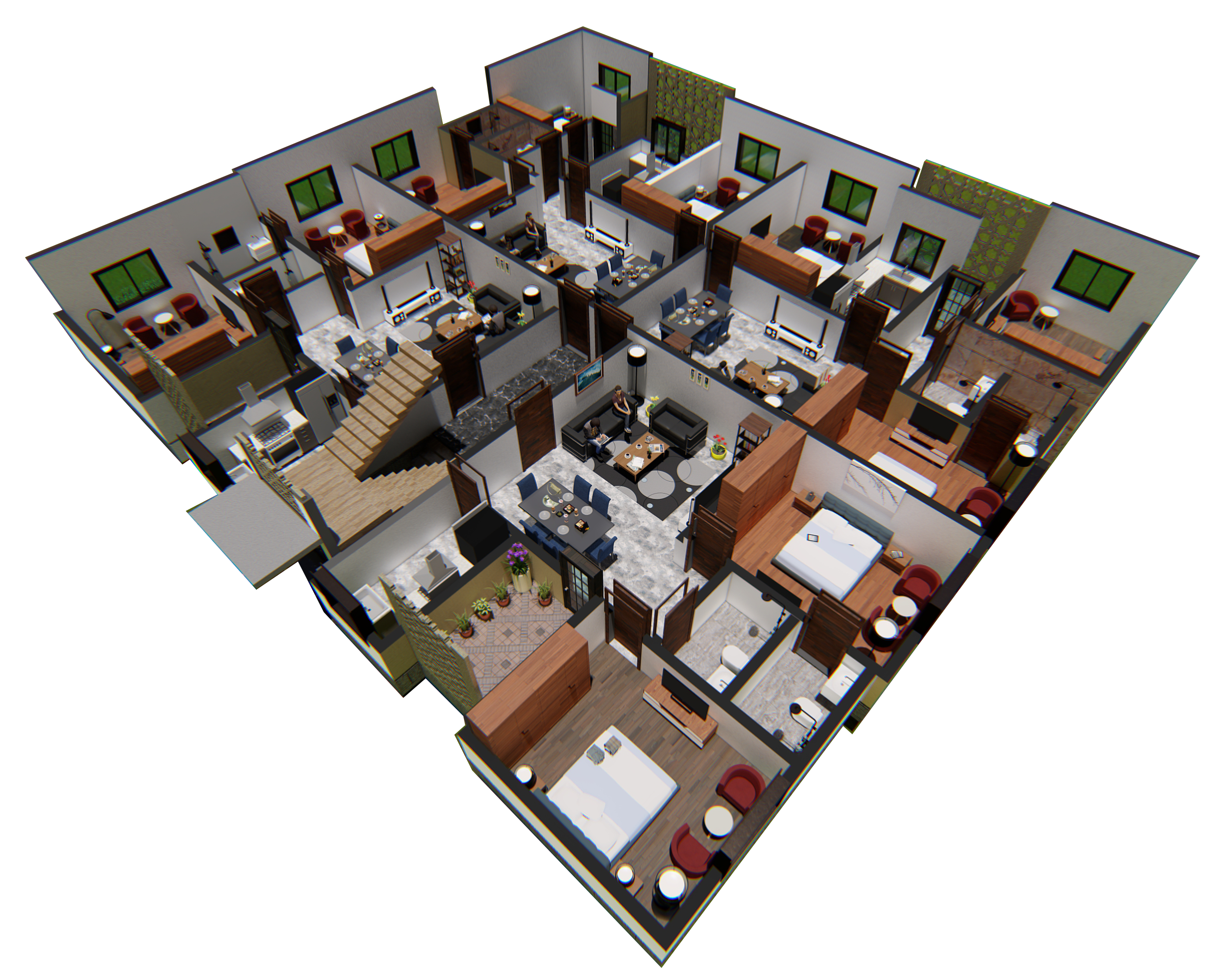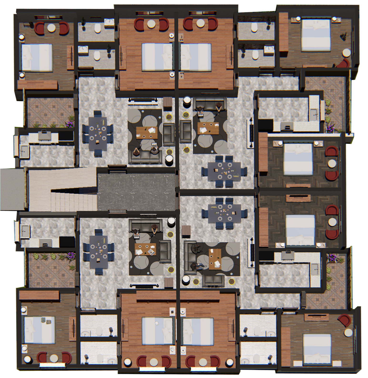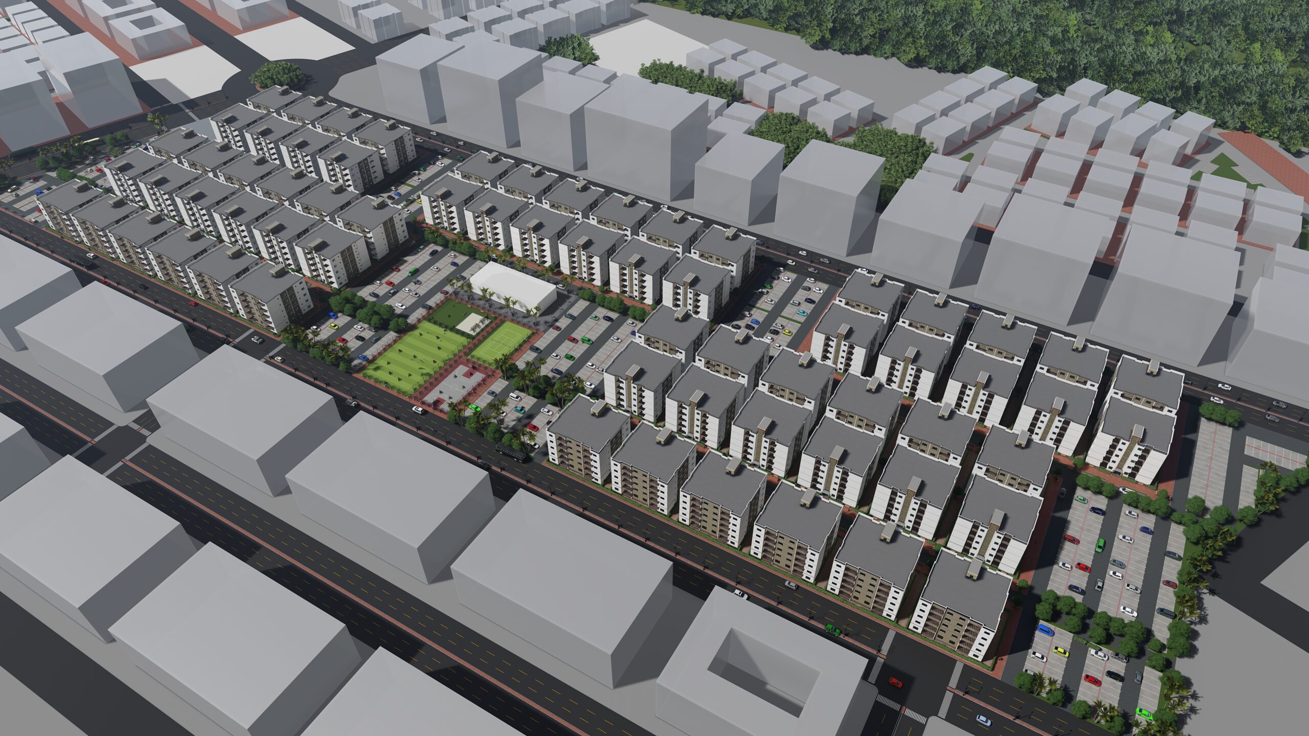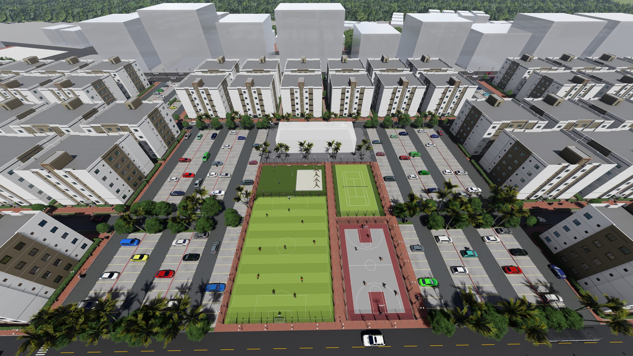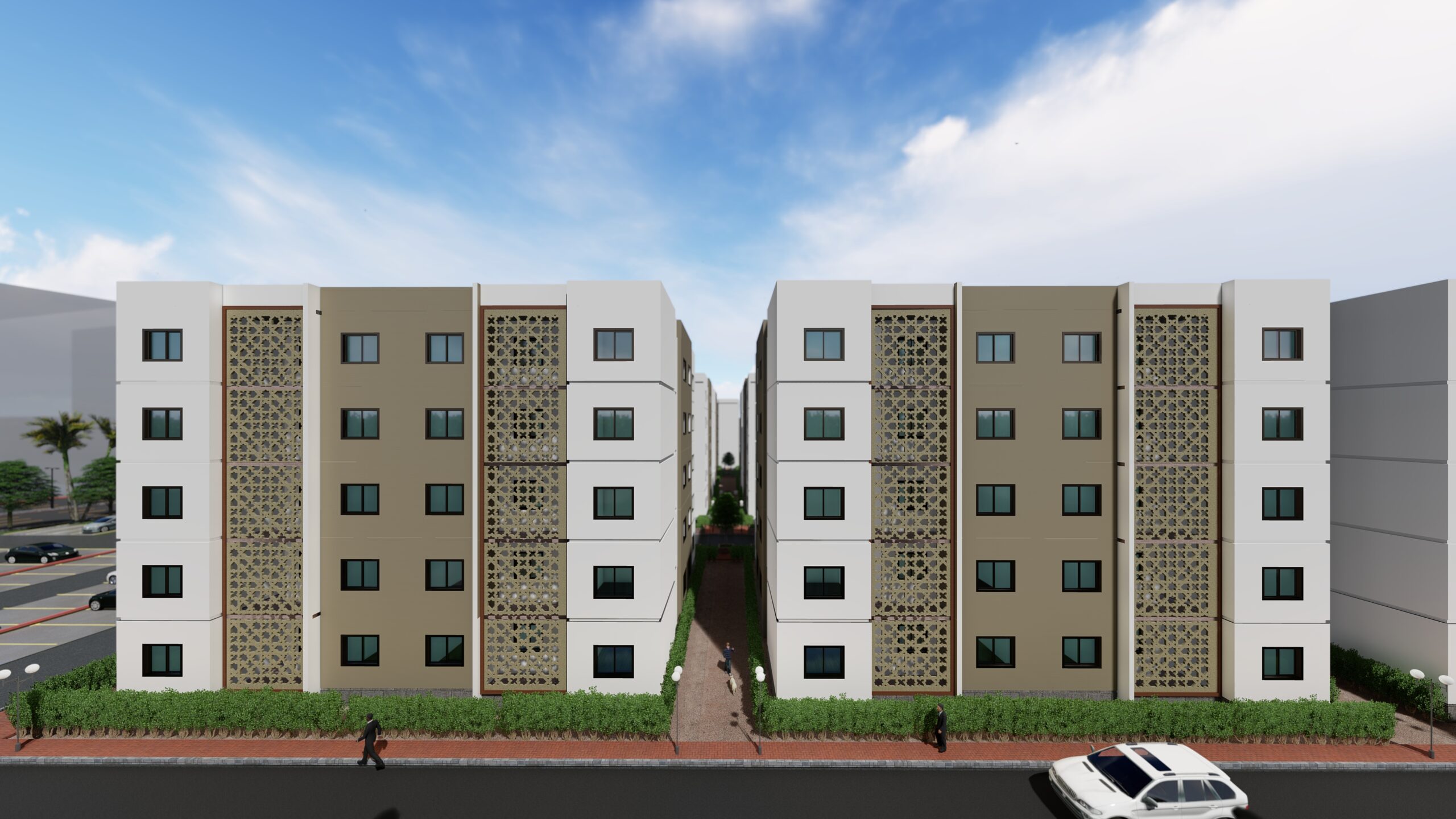 La cité « Les Résidences Etoile » possède son propre écosystème d’espaces communs, tels que le club house pour les loisirs, des aires de jeux, des zones commerciales et de vastes espaces de stationnement. 65% du terrain a été consacré aux espaces communs, ce qui montre la grandeur du projet. Chaque bâtiment dispose de quatre espaces ouverts pour accueillir la lumière du soleil et l’air frais dans chaque appartement. Les appartements sont conçus pour accueillir du mobilier de standing.